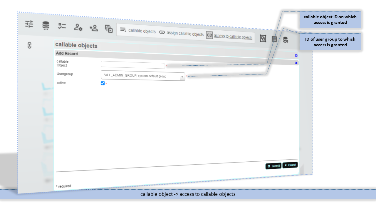 With this feature you can grant execution writes to a callable object to a usergroup. If a user is member of a usergroup that has access to the callable object then the link to start the callable object appears in the callable object pop-up window.