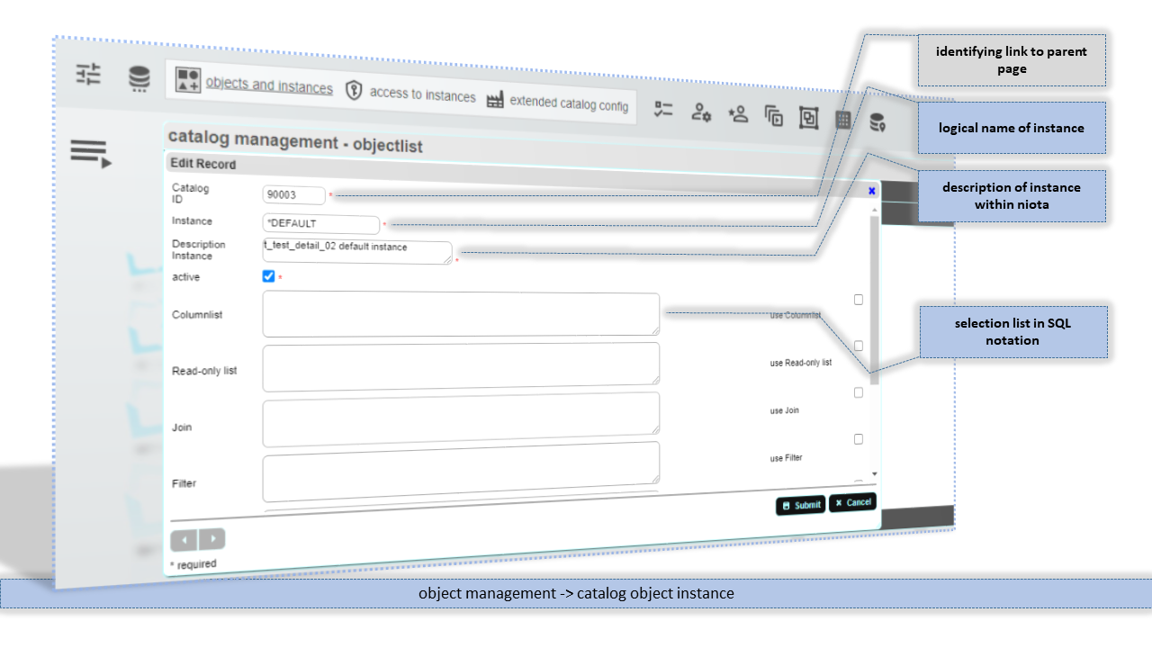 Any table or view that should be managed by niota must be configured as a so called catalog object. Every catalog object has a unique ID by which this object is referenced later on. See below how to create a catalog object.