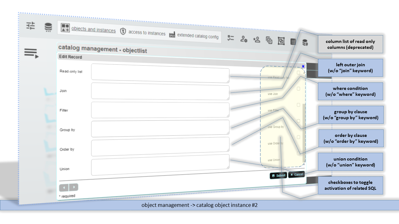 An instance is a default or a configured representation of a catalogobject. By default for every catalog object the *default instance is created. You must not delete the *default instance of an catalogobject.