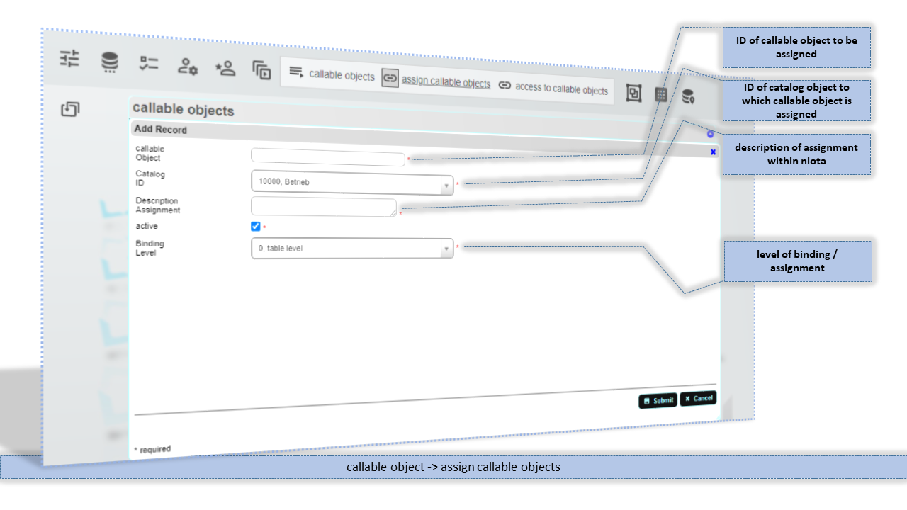 With this feature you can assign a callable object to a catalog object. You can also configure if the callable object should be bound on object level (table or view) or on record level.