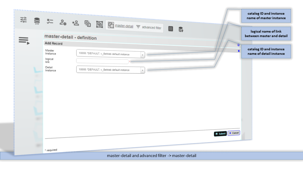 With this feature you can configure a master-detail relationship between up to four tables. One table is the master table, up to three tables may be assigned as detail tables of the same level. Master table and all assigned detail tables are displayed together in the grid area. The detail tables are filtered by the values of the selected row of the master table.