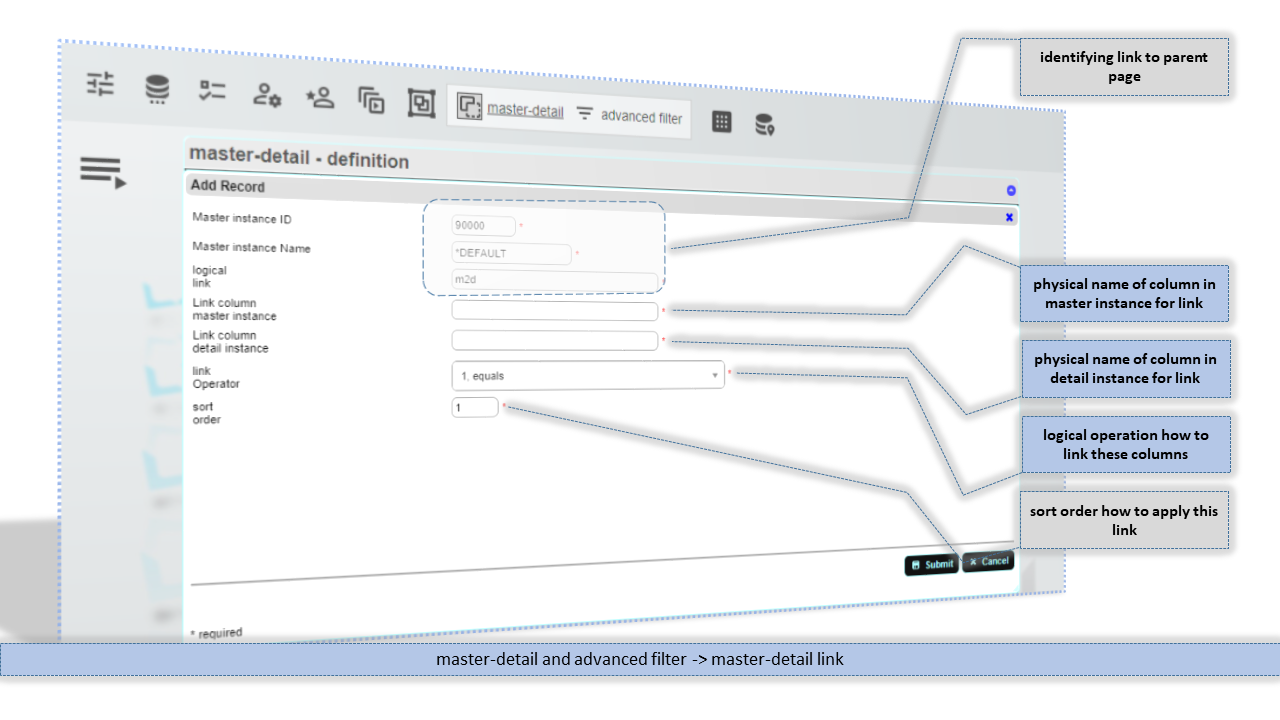 Physical column name from detail instance that is used to link between master catalog object and detail catalog object. You can use multiple linking columns. Also in case the column name in master catalog object and detail catalog object is the same you have to specify both.